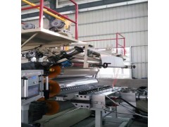 PVC石塑地板生产线简称“SPC地板生产线”,SPC地板生产线由自动上料进入高速混料机、高速热混、冷混,可再配五吨储料罐及每个进料囗配上环保吸尘系统(使车间无灰尘)、再自动上料到双螺杆挤出机、由大板模具结构出料进行五辊定型模定型(其间表面多层膜同时进入五辊热粘合于一体),排辊托架冷装置、裁边装置、牵引机、自动切割机、自动抬板等组成。机组结构紧凑,性能优良。螺杆、料筒经优化设计,并采用双合金钢专项加工,使整机具有塑化均匀,挤出量稳定,产量高,寿命长等优点。主机料筒采用铸铝加热器加温,风冷却,精密电脑屏控制温度。精密的定型压光装置,通过其良好的调整功能使板材定型优良。切割部分采用定长切割装置,保证板材长度正确.SPC 地板是由挤出机 EXTRUDER 挤出 PVC 的基材,用五辊压延机组,分别把 PVC 彩膜+PVC 耐磨层+PVC 底膜,一次性压贴复合而成的产品,工艺简单、贴合靠热量完成,不含胶水。表面不需要增加另外机械设备,配有机械手减少人工投入,减少投入成本,基本实现自动化生产工艺.